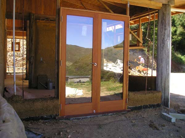 The walls of the downstairs of the house were constructed of cob - basically clay that was excavated when the site was cleared, sand, straw and water. Also plenty of elbow grease!